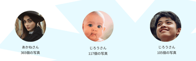 AIが人物の顔を自動で認識して、「〇〇ちゃん」「△△くん」というように、人物ごとに写真をグループ化してくれます。 - モノ・場所認識