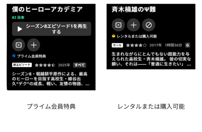 プライムビデオの画面には、「プライム」マークが付いている作品と、小さな「レンタル」や「購入」マークが付いている作品があります。